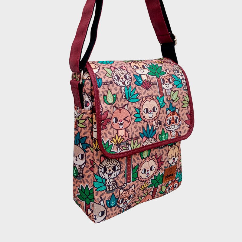 Carriel de la colección Selva felina, con correa manos libres y  bolsillo en secundario.