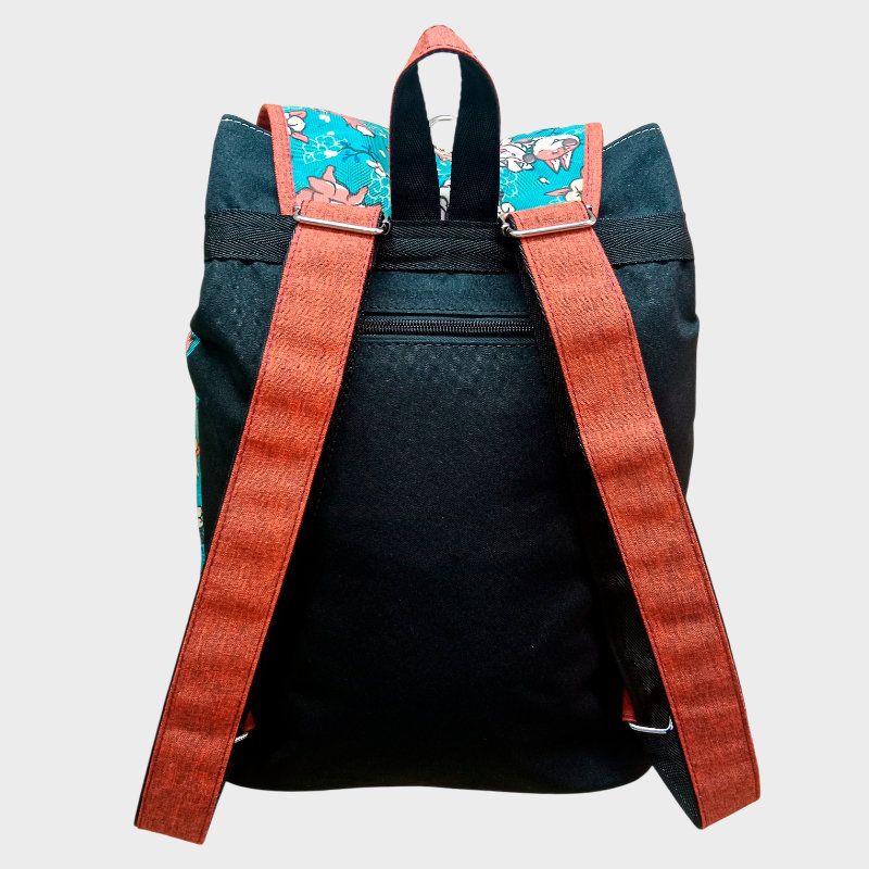 Un hermoso morral de tapa con seguro de mosquetón y cordón, cuatro bolsillos, uno de ellos a en el espaldar. Tiene un amplio compartimento principal, es impermeable y su forma lo hace muy cómodo de llevar en la espalda,  además,  su estilo singular con tapa y cordón le da un plus especial para llevarlo cada día.